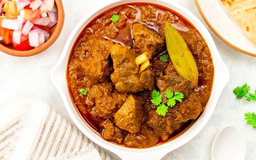 Our Goat Curry is crafted with tender goat meat on the bone, slow-cooked in a traditional Indian gravy made from tomatoes, onions, ginger, garlic, and a blend of premium spices. The curry delivers deep, bold flavours that highlight the richness of authentic Indian cuisine. The combo includes basmati rice, soft naan or roti, and sides, offering a complete, satisfying Indian meal.